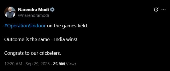 प्रधानमंत्री नरेंद्र मोदी ने ऑपरेशन सिंदूर का जिक्र करते हुए एक्स पोस्ट में लिखा, "खेल के मैदान पर ऑपरेशन सिंदूर. परिणाम वही जीता भारत, हमारे क्रिकेटरों को बधाई."
