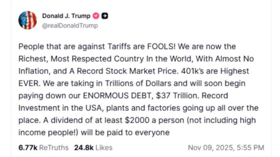 ट्रम्प ने कहा कि देश में रिकॉर्ड निवेश हो रहा है, "सभी जगह संयंत्र और कारखाने स्थापित हो रहे हैं।" उन्होंने आगे बताया कि "प्रत्येक व्यक्ति को कम से कम 2,000 डॉलर का लाभांश दिया जाएगा (उच्च आय वाले लोगों को छोड़कर!)।" हालांकि प्रस्तावित भुगतान के बारे में कोई और विवरण नहीं दिया गया। ये टिप्पणियां अमेरिकी सुप्रीम कोर्ट द्वारा 6 नवंबर को ट्रंप के राष्ट्रपति कार्यकाल के दौरान लगाए गए वैश्विक टैरिफ पर बहस शुरू होने के कुछ दिनों बाद आई हैं, जिसमें उनके द्वारा बचाव की जा रही नीतियों की चल रही कानूनी जांच पर प्रकाश डाला गया है।